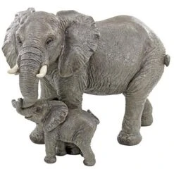 Symbolizing good luck, wisdom and serenity, these exotic elephants, a mother and calf, entwine trunks in a wildlife statue celebrating one of nature’s most majestic animals. These garden pachyderms are realistically sculpted with wide leathery ears and faux ivory tusks before being cast in designer resin and hand painted in exquisite detail. Our Design Toscano-exclusive elephant sculpture lends a powerful sense of nature and safari adventure to your decor. 21″Wx11œ”Dx15″H. 9 lbs.
